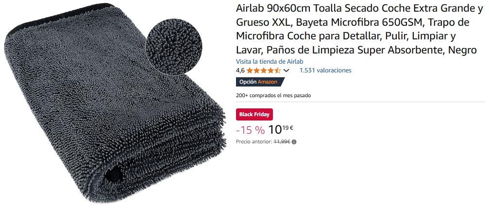 La primera tiene un 15% de descuento y su valor actual es de 10,19 euros. El paño de microfibra mide 90 por 60 centímetros. “Cuando se cuidan adecuadamente, nuestras toallas de limpieza para coches pueden ser lavadas y reutilizadas cientos de veces sin preocuparse de que se encojan, se deshagan o pierdan su poder de limpieza. No sueltan pelusa, por lo que no hay que preocuparse de que se manchen o atasquen la lavadora”, asegura el fabricante.