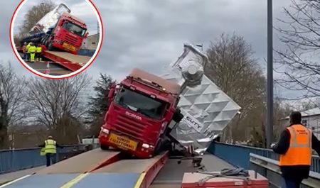 El camión, en su totalidad, pesaba 220 toneladas y el vídeo se ha viralizado rápidamente en las distintas plataformas. En las imágenes se ve claramente cuando el joven conductor salta del vehículo, pues la estructura de acero colocada debajo del camión falló y el remolque se inclinó hacia un lado.