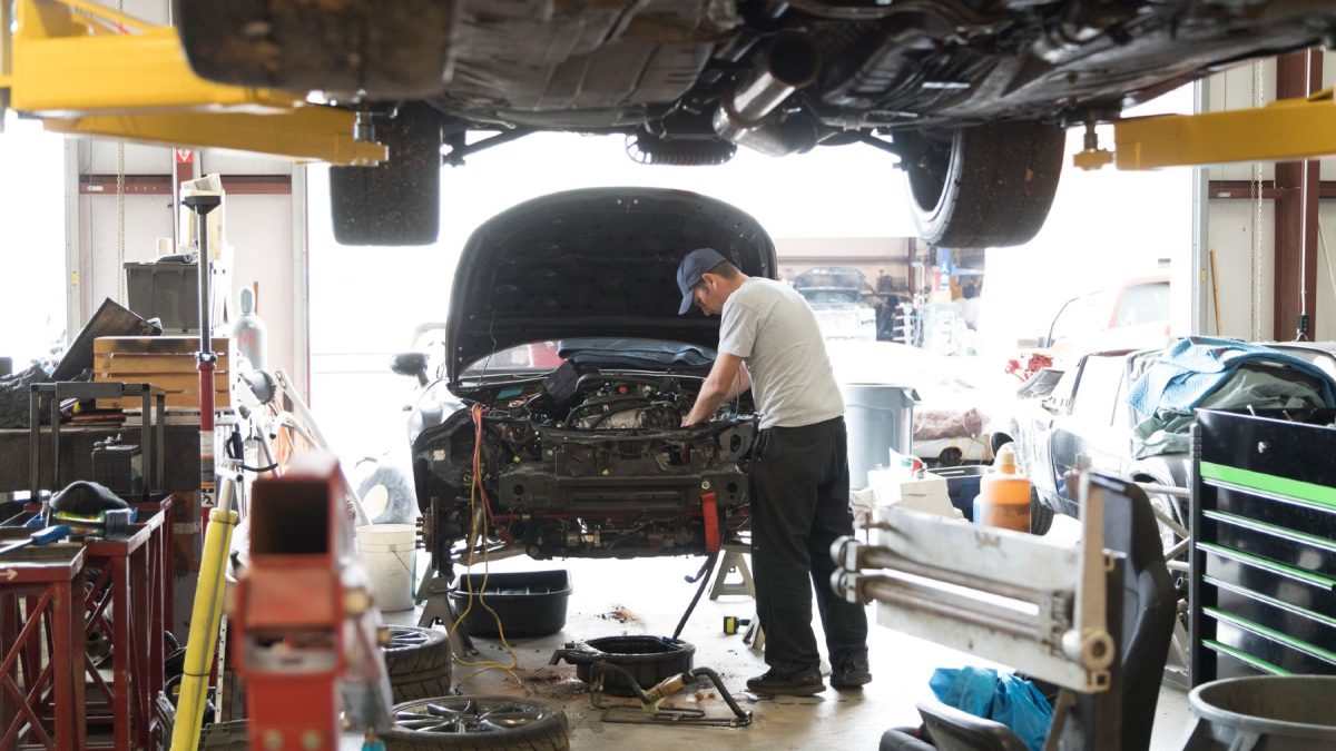 Un mecánico revisando un coche en el taller.