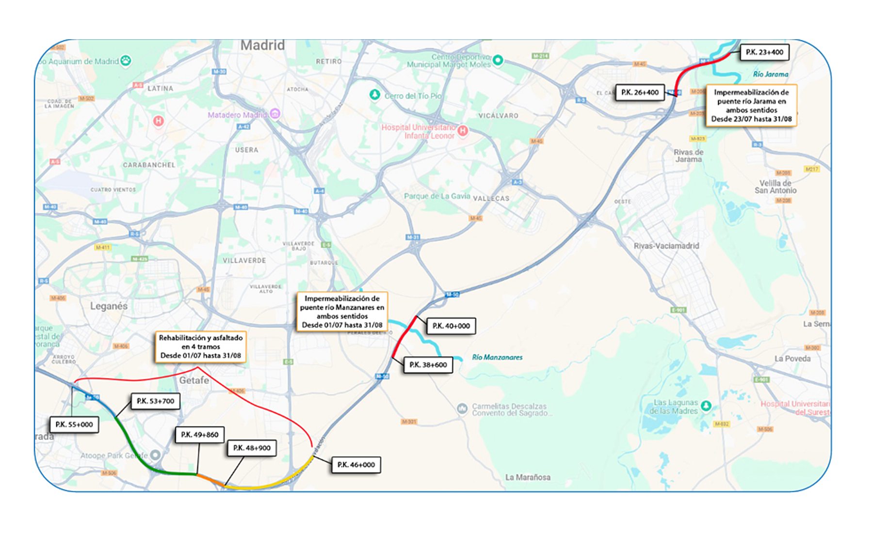 La M-50 será uno de los puntos neurálgicos de estas actuaciones, con trabajos intensivos de rehabilitación y asfaltado entre los kilómetros 55 y 46. Además, se llevará a cabo la impermeabilización de las estructuras sobre los ríos Jarama y Manzanares. Estas obras, que ya se iniciaron el pasado verano, continuarán con una fase intensiva de puesta a punto, incluyendo la rehabilitación del firme de hormigón del Eje Culebro y la impermeabilización de los tableros de las estructuras del tronco de la autovía.