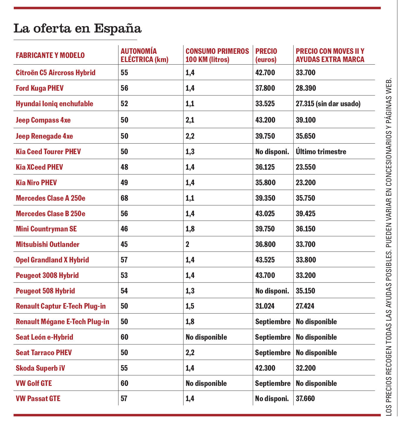 La autonomía eléctrica ronda los 50 kilómetros en muchos modelos y, según la longitud de los trayectos diarios, se podría no consumir de lunes a viernes, o que este gasto fuera mínimo y mejor que el de los híbridos y diésel. El registro de la tabla se refiere solo a los primeros 100 kilómetros recorridos, y siempre que se parta con la batería llena. Después, el fin de semana o cuando se precise, el propulsor de combustión dará para viajar sin limitaciones, aunque también con mayor consumo.