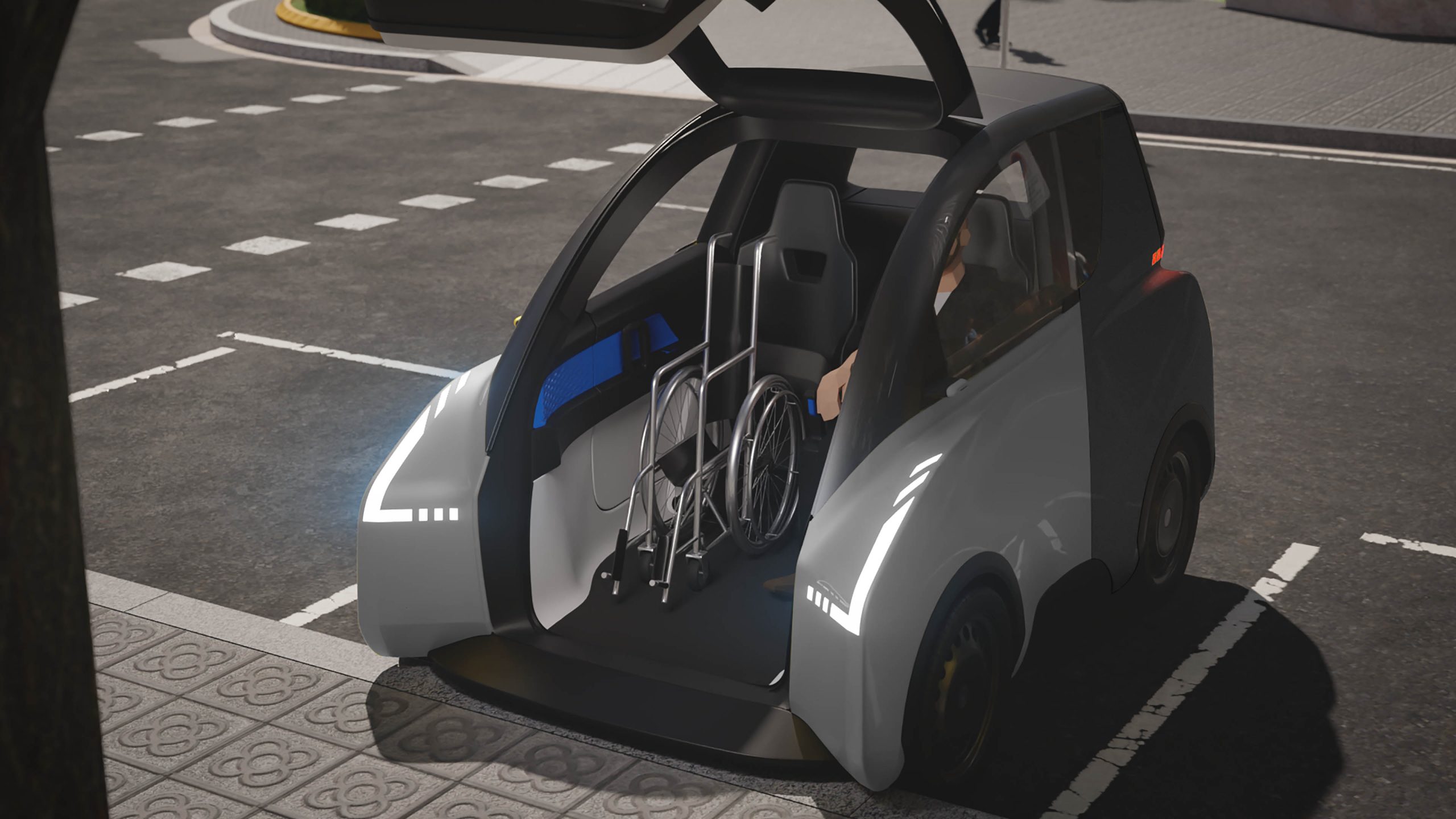 En configuración corta mide 2,5 metros y tiene dos plazas, a las que se accede desde el frontal, que se abre en vertical. Por sus reducidas dimensiones, puede estacionarse en perpendicular a la acera. Además, el acceso frontal permite entrar a la cabina directamente con una silla de ruedas, facilitando así también su uso a personas con minusvalías físicas. En configuración larga, por su parte, crece 37 centímetros, suma una puerta lateral y puede disponer de 2+2 plazas, o de dos con espacio para carga.