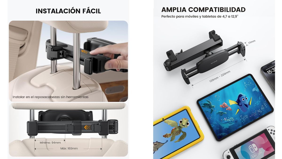 Por último, este soporte de tableta para el coche es universal, así que se podrá poner casi cualquier tipo de dispositivo que tenga un tamaño entre los 10 y 33 centímetros. Móviles, tabletas, modelos tipo Kindle o hasta una Nintendo Switch se pueden enganchar en su brazo extensible. El único requisito es que estos dispositivos deben tener un grosor inferior a los 17 milímetros.