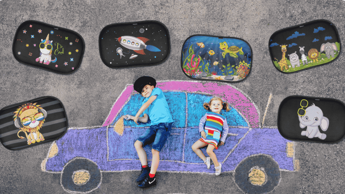 Incluye dos parasoles que se fijan rápida y fácilmente a las ventanas laterales traseras gracias a sus cuatro ventosas. Fabricados con un denso tejido de malla que ofrece un 99,8% de protección frente a la radiación UV, son ideales para proteger a niños o mascotas que viajen en el interior del vehículo. Miden 51 x 31 centímetros y cuenta con una gran variedad de originales diseños infantiles que, además de cumplir con su función, harán las delicias de los más pequeños.