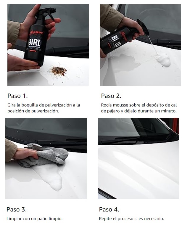 Otra opción y en otro formato. Se trata de un eliminador de excremento de pájaros en versión líquida (500 mililitros). Combate todas las manchas provocadas por restos de insectos, excrementos de aves o viejas suciedades con una potente fórmula para combatir las manchas (15,95 euros).