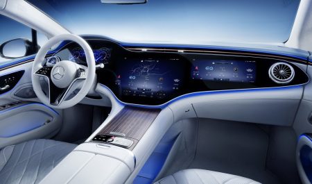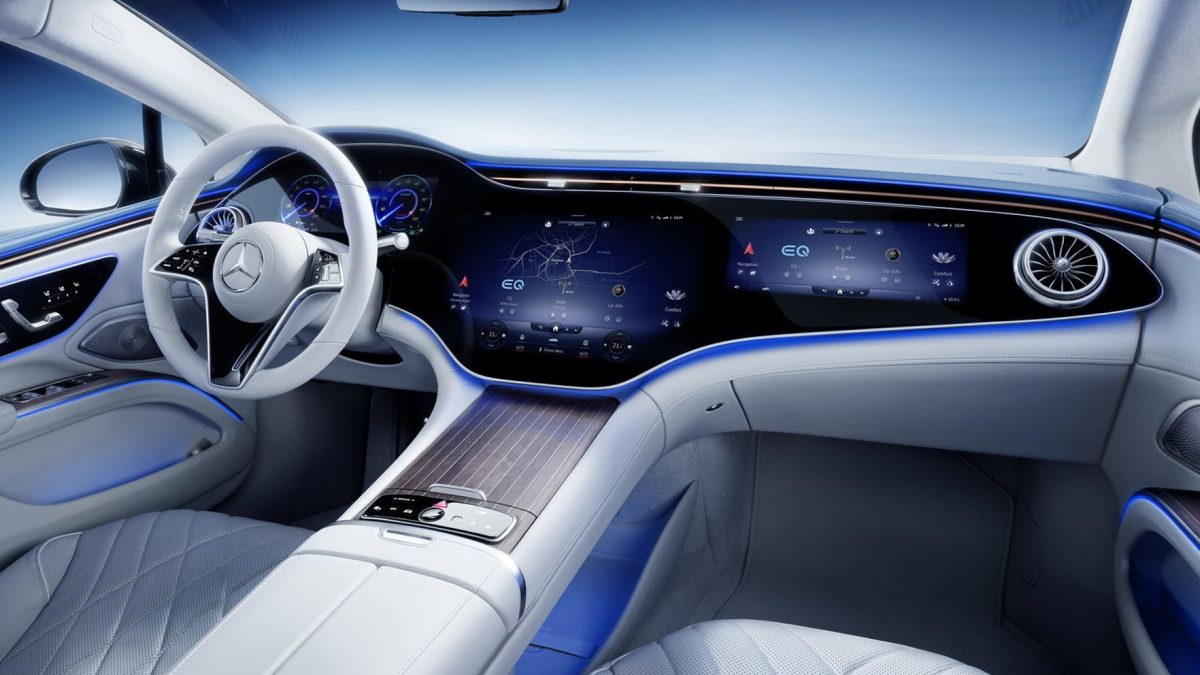 La berlina eléctrica alemana reemplaza el salpicadero tradicional por el Hyperscreen, una pantalla curva de 56 pulgadas, con 141 centímetros de ancho y un área de 2.432,11 cm2. En realidad, tiene tres pantallas independientes: el cuadro de instrumentos, la consola central y una tercera para el copiloto. Además, está disponible una configuración más tradicional con pantallas independientes, si el cliente lo desea así. -