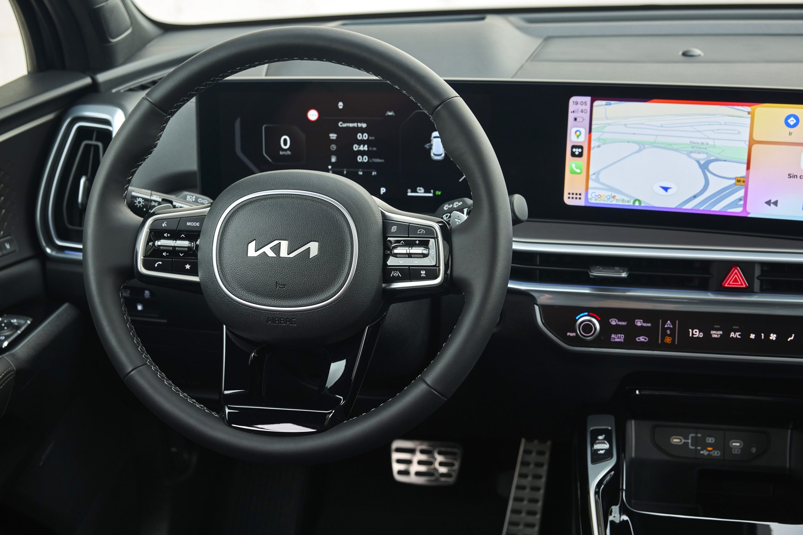 En todo caso, la principal renovación del Kia Sorento se encuentra en su habitáculo, con capacidad para siete ocupantes gracias a dos plazas auxiliares de una tercera fila de asientos en el maletero. Lo primero que reclama la atención es su centro de información y conectividad, confiado a una doble pantalla de 12 pulgadas cada unidad, con la forma curvada ya vista en los más últimos modelos de la casa.