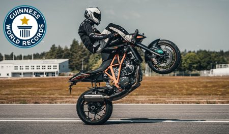 El piloto no solo tiene un Récord Guinness en su haber. Solo unos meses después de lograr el caballito, fue a por el siguiente: la mayor distancia conducida marcha atrás sobre una motocicleta.