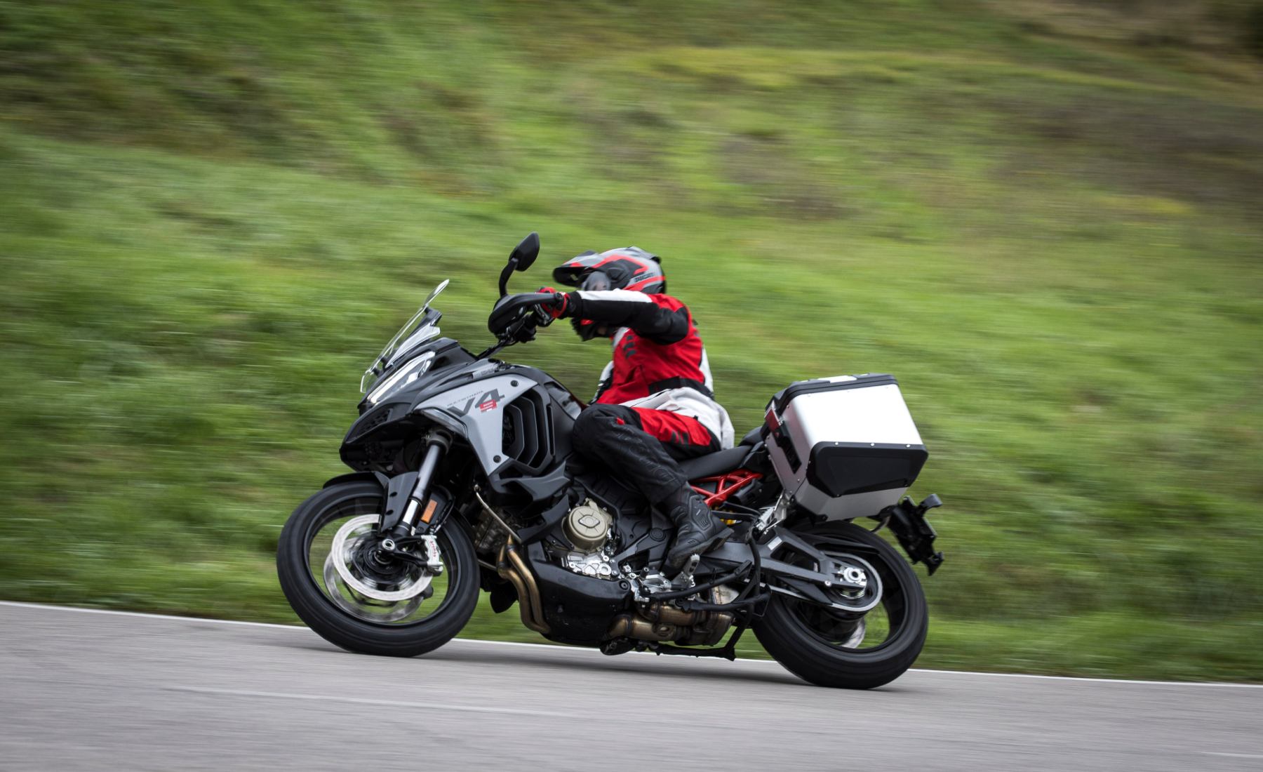 Este tipo de vías permite que la Ducati brille sobremanera. Al seleccionar el modo Sport, la entrega de potencia es inmediata (los 170 CV aparecen sin filtro), catapultando increíblemente rápido la Multistrada a la siguiente curva. Además, su chasis monocasco de aluminio, junto con las nuevas llantas más ligeras, otorgan una agilidad sorprendente para una moto de su tamaño.