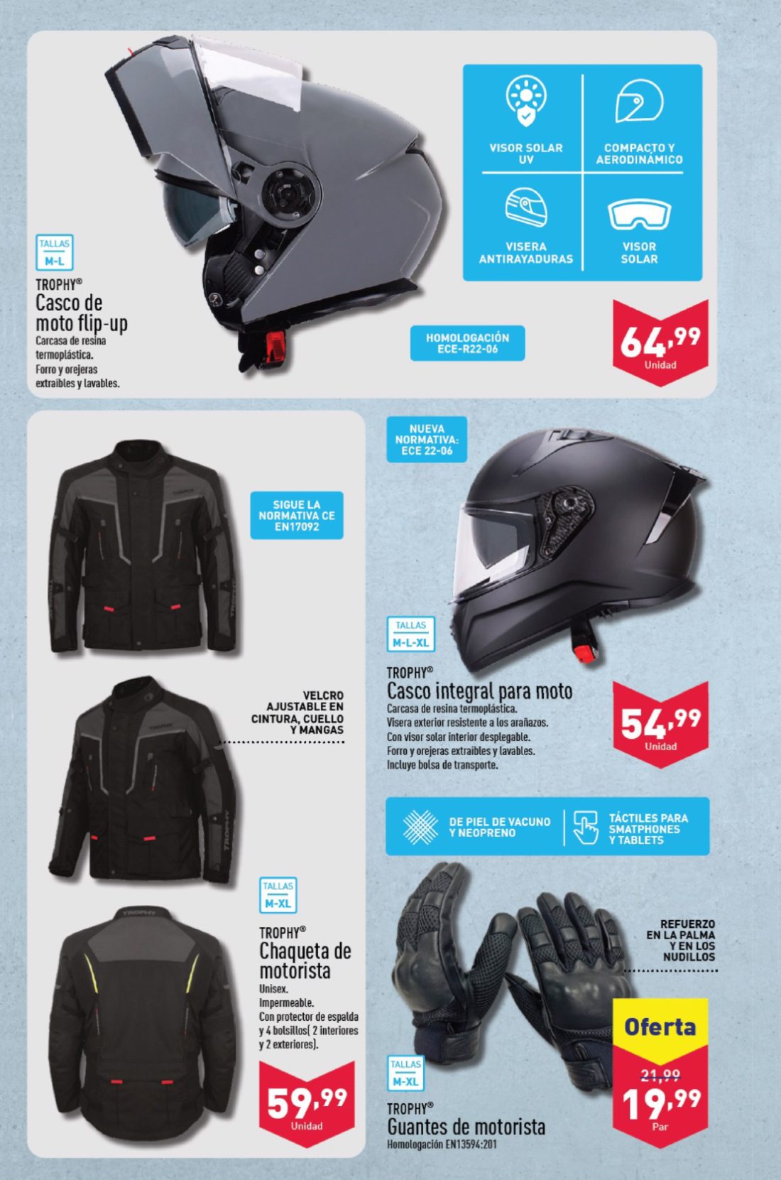 Aldi, la cadena alemana de supermercados, con cerca de 400 tiendas repartidas por toda España, es conocida por ofrecer una amplia variedad de productos con buena calidad a precios muy competitivos. En su catálogo de ofertas de esta semana, disponen de una sección en la que ofrecen equipación para los motoristas a precios muy ajustados. Cabe recordar que estos productos han pasado las respectivas homologaciones de la Unión Europea, por lo que son perfectamente legales para circular con ellos.