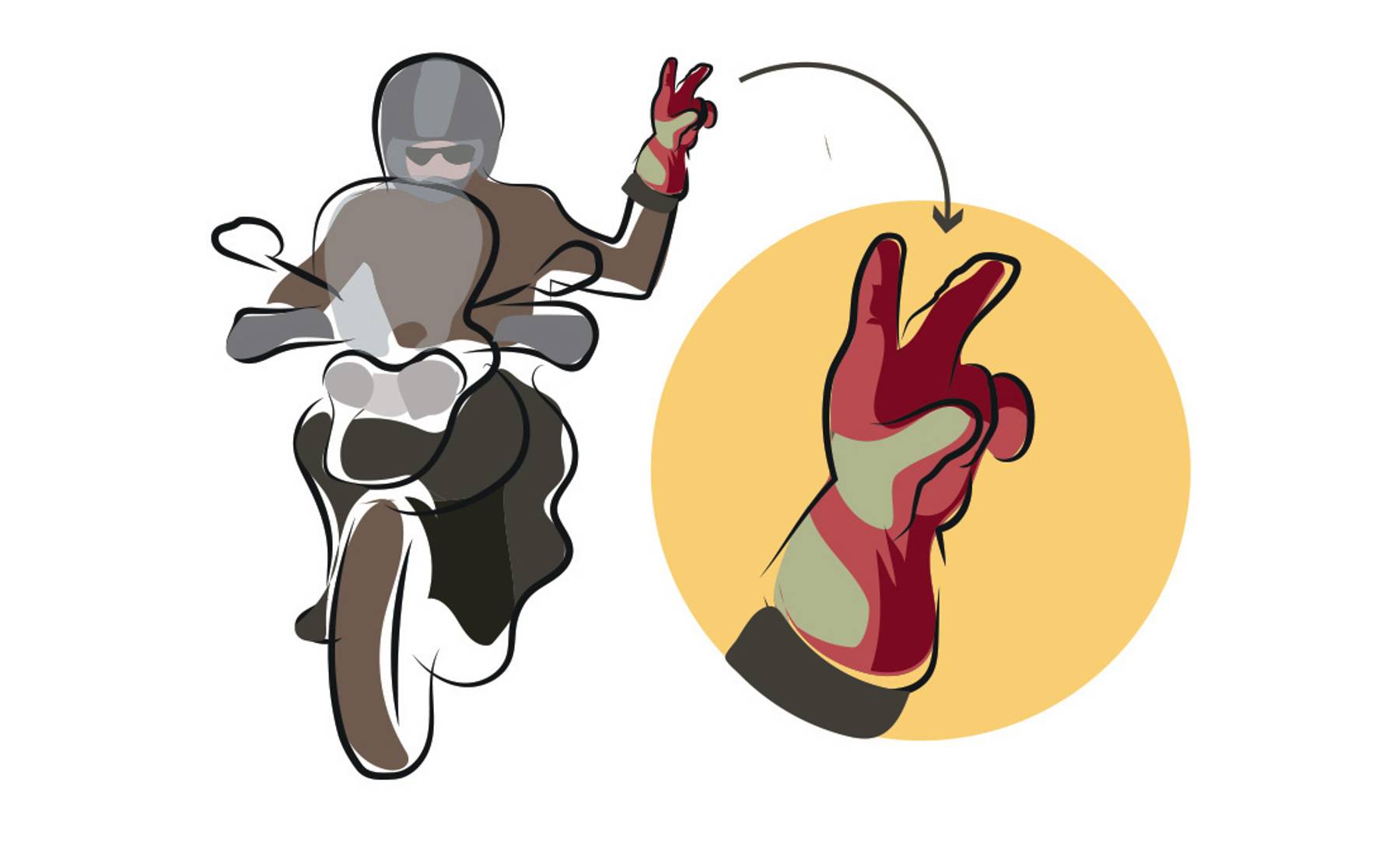 Es el gesto motero por excelencia. Cuando los motoristas se cruzan por la carretera, realizan este gesto para saludarse. Se emplea la mano izquierda (con los dedos índice y corazón realizando el gesto de la V), para no soltar la mano derecha del acelerador.