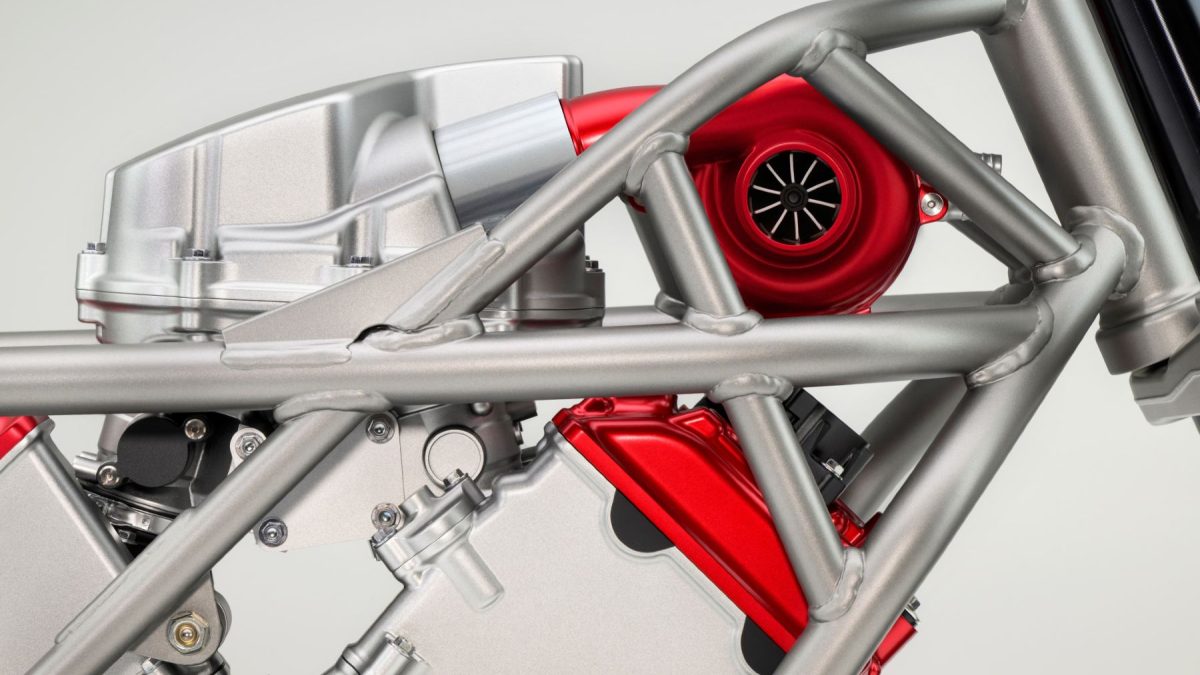 Este nuevo V3 de Honda cuenta con un compresor eléctrico, una innovación inédita en la industria de la moto. La incorporación de este elemento permite un control preciso de la compresión del aire de admisión, logrando un alto par incluso a bajas revoluciones.