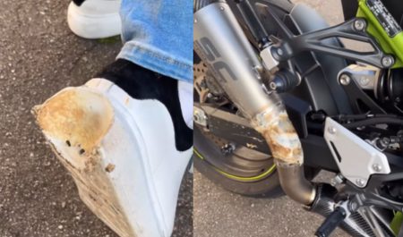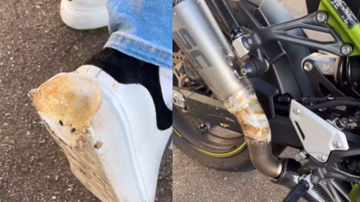 Claro que, si como este propietario, cambia el tubarro y no tiene cuidado de instalar una placa anticalórica, puede sucederle lo que se ve en el vídeo. Porque si a esto se le suma el descuido de llevar el pie retrasado en el reposapiés y va apoyado en el ‘tubarro’ sin protección, pasará lo que se ve en el vídeo. Y menos mal que no llegó la piel.