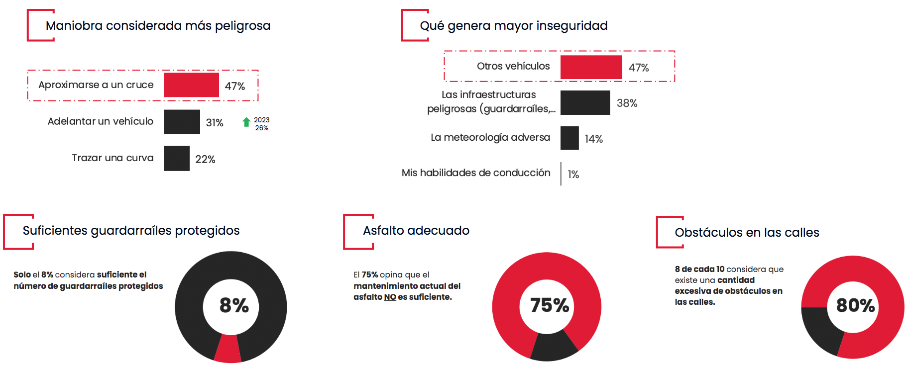 El estado de las carreteras es una materia que no convence a la mayoría de los motoristas. Solo el 15% considera que el asfalto es adecuado, un cambio notable respecto a la encuesta de 2023, en la que el 39% eran de la misma opinión. En la misma línea, solo el 8% considera que el número de guardarraíles protegidos sea suficiente, mientras que el 80% de los motoristas cree que hay demasiados obstáculos en las calles.