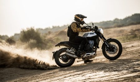 La segunda, denominada Scrambler, está pensada para aquellos que quieran aventurar se fuera del asfalto, donde ofrece garantías a una altura libre al suelo aumentada (21 centímetros), neumáticos mixtos trail, una rueda delantera más grande (19 pulgadas), suspensiones con mayor recorrido y amortiguadores regulables en precarga, compresión y extensión.