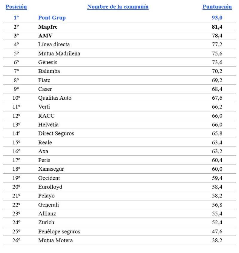 En lo más alto de esta prestigiosa clasificación se encuentra Pont Grup, con una sobresaliente puntuación de 93,0 puntos. Su liderazgo se explica por una combinación de factores diferenciadores: un elevado grado de especialización en seguros de moto, una destacada presencia en el mundo del motociclismo mediante patrocinios a pilotos y equipos de MotoGP, además de las alianzas estratégicas como aseguradora oficial de marcas como Peugeot, Yamaha o Piaggio.