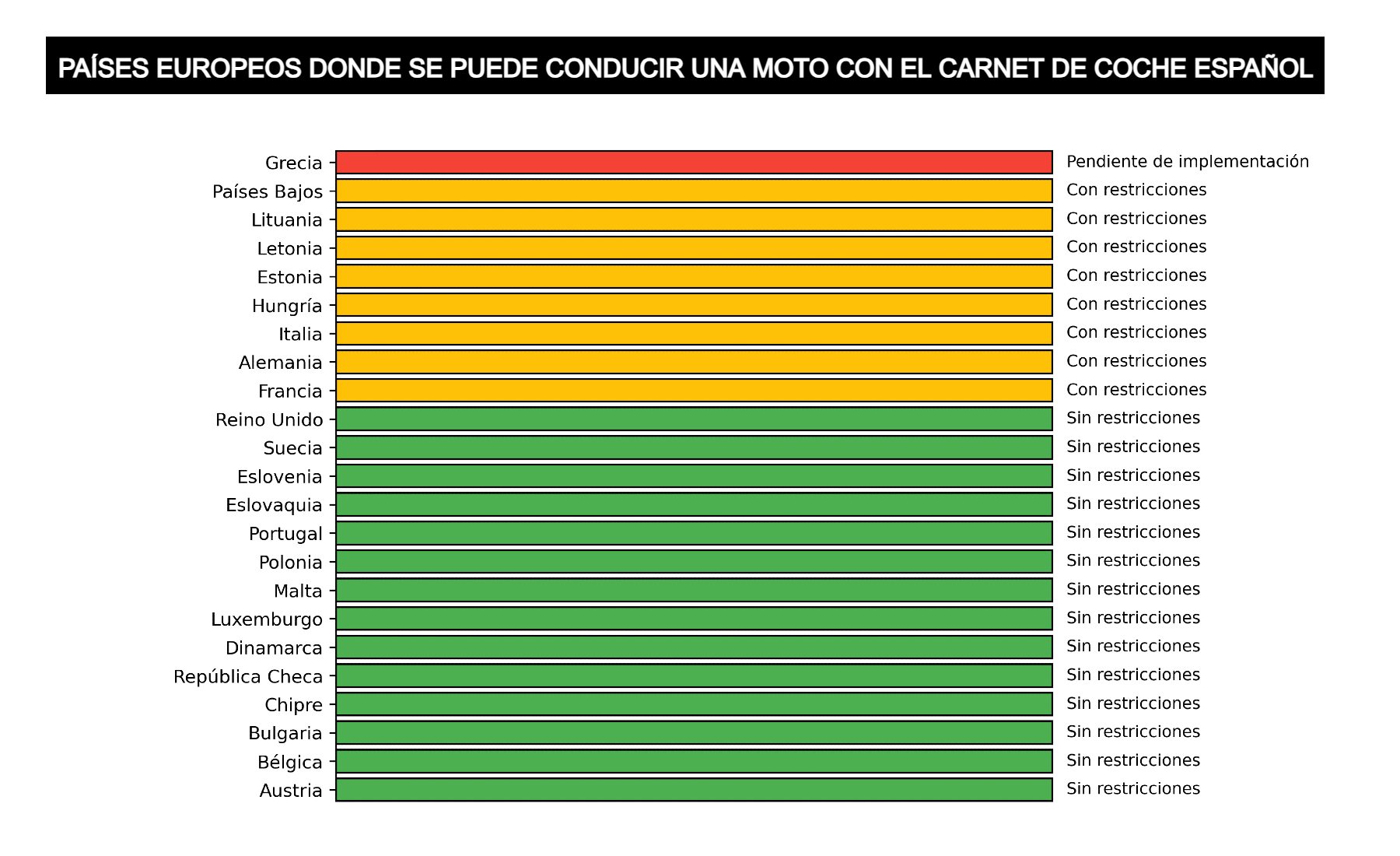 Entre los destinos más accesibles para los conductores españoles se encuentran Austria, Bélgica, Bulgaria, Chipre, República Checa, Dinamarca, Luxemburgo, Malta, Polonia, Portugal, Eslovaquia, Eslovenia, Suecia y Reino Unido. En todos ellos, el carnet de coche español es suficiente para ponerse al manillar de una motocicleta ligera.