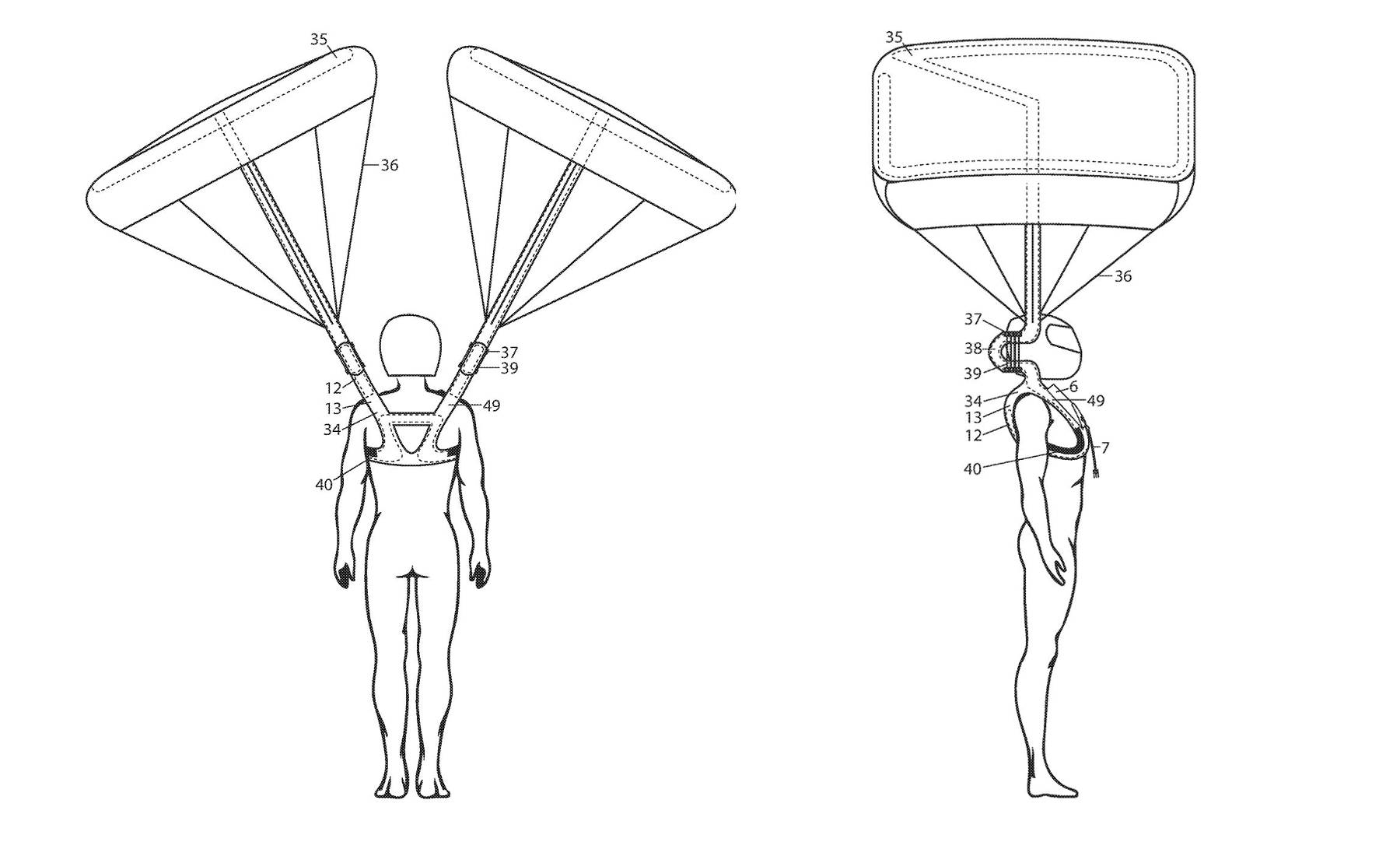 El dispositivo se ubicará a cada lado del pecho del piloto. Al detectar una caída, el sistema se disparará desplegando las velas. Posteriormente, dos cintas laterales a los lados del casco se encargarán de mantener recto el paracaídas, logrando estabilizar al piloto.