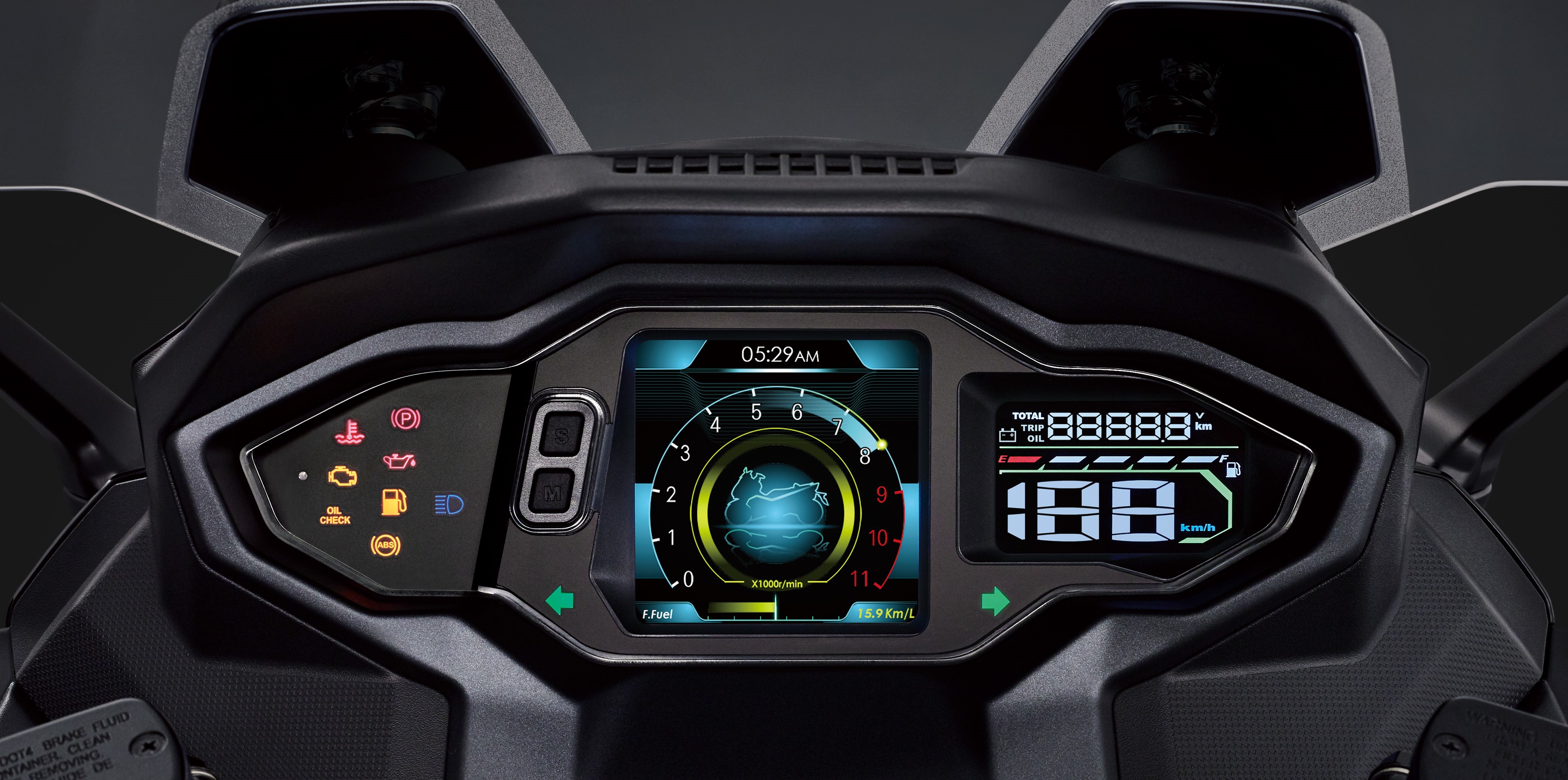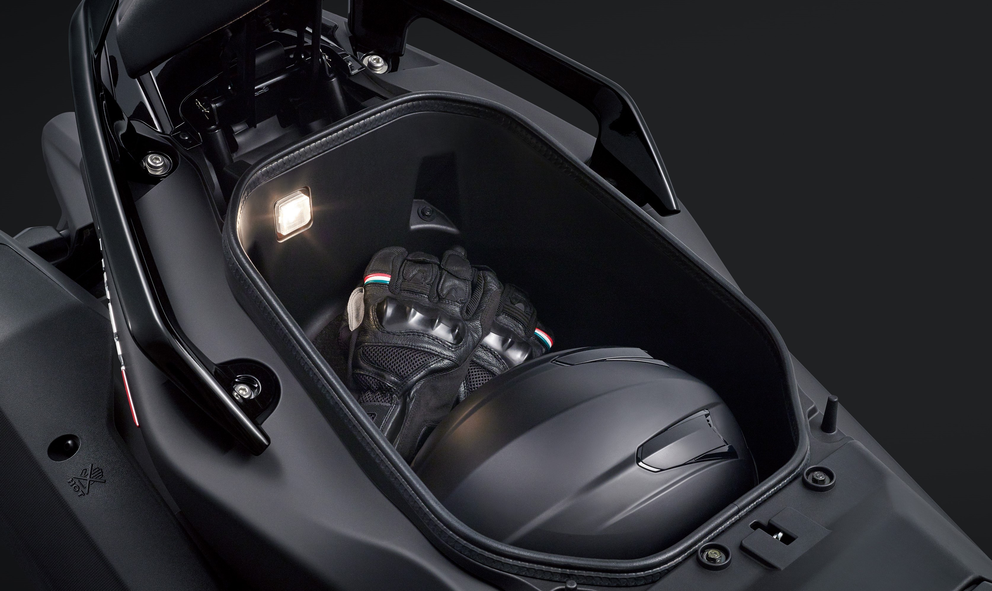 En cuanto a su equipamiento, toda la iluminación es por LED, la pantalla del parabrisas se puede regular en altura en dos posiciones, la instrumentación digital incluye varias configuraciones y al extender la pata de cabra se conecta el freno de estacionamiento. Además, dispone de apertura remota para el tapón de gasolina y toma USB, y en el hueco bajo el asiento caben un casco integral o dos jets.