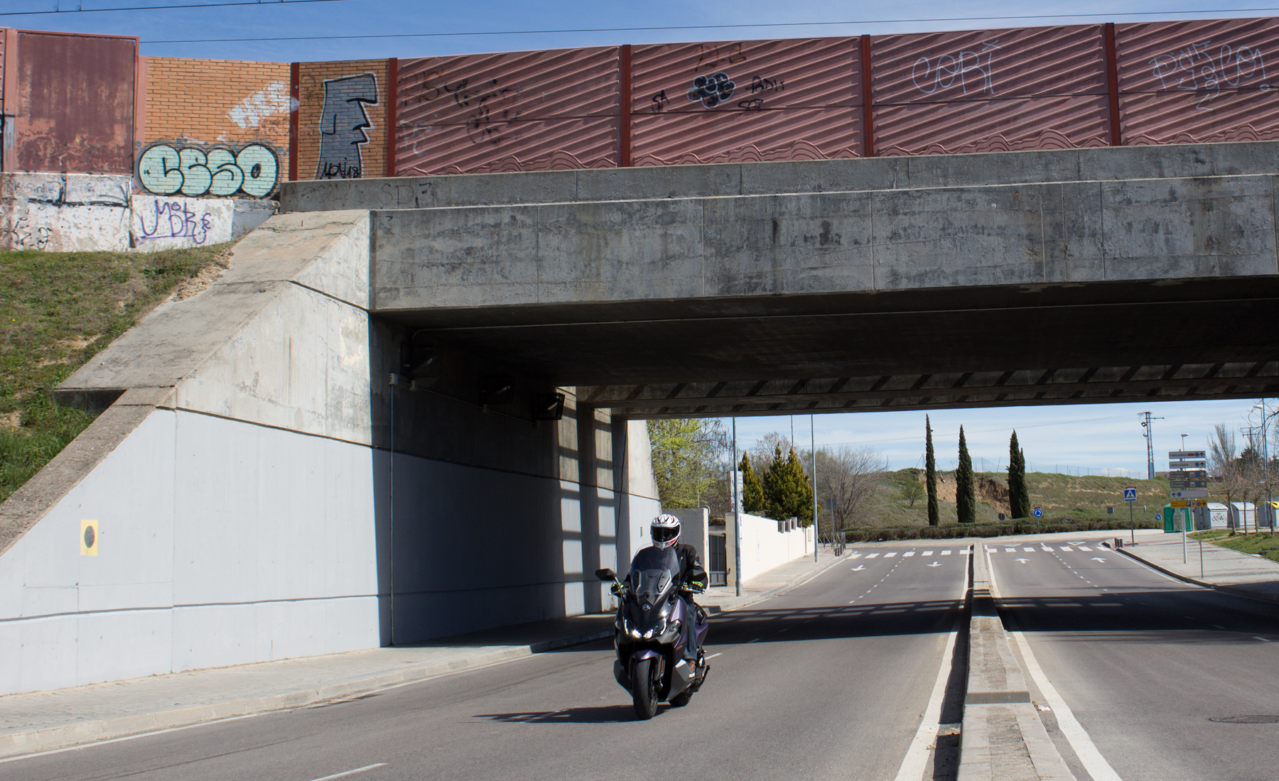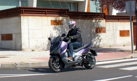 Al dejar atrás la ciudad, incorporándose a las carreteras de circunvalación, el maxiescúter de SYM se desenvuelve a la perfección. Con un pequeño golpe de acelerador se suma a la velocidad del tráfico.