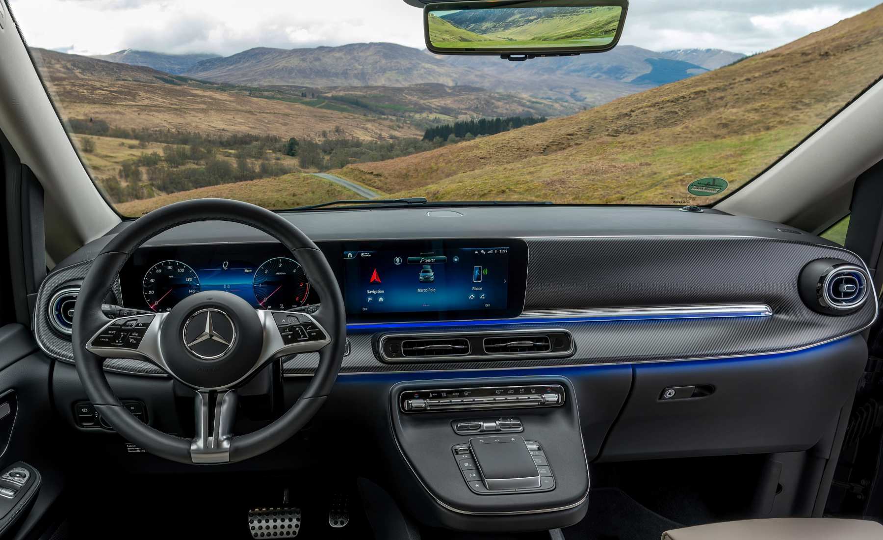 Otro de los grandes cambios en la nueva Marco Polo ha sido el cuadro de mandos centrado en la digitalización. Dispone de un panel de instrumentos rediseñado con dos pantallas panorámicas de 31,24 centímetros (12,3 pulgadas), nuevas salidas de aire y un innovador volante con reconocimiento capacitivo de manos libres. Además, equipa de serie el sistema multimedia MBUX de manejo intuitivo. Gracias a la inteligencia artificial y la capacidad de personalización, tiene una alta capacidad de aprendizaje y se adapta al usuario.
