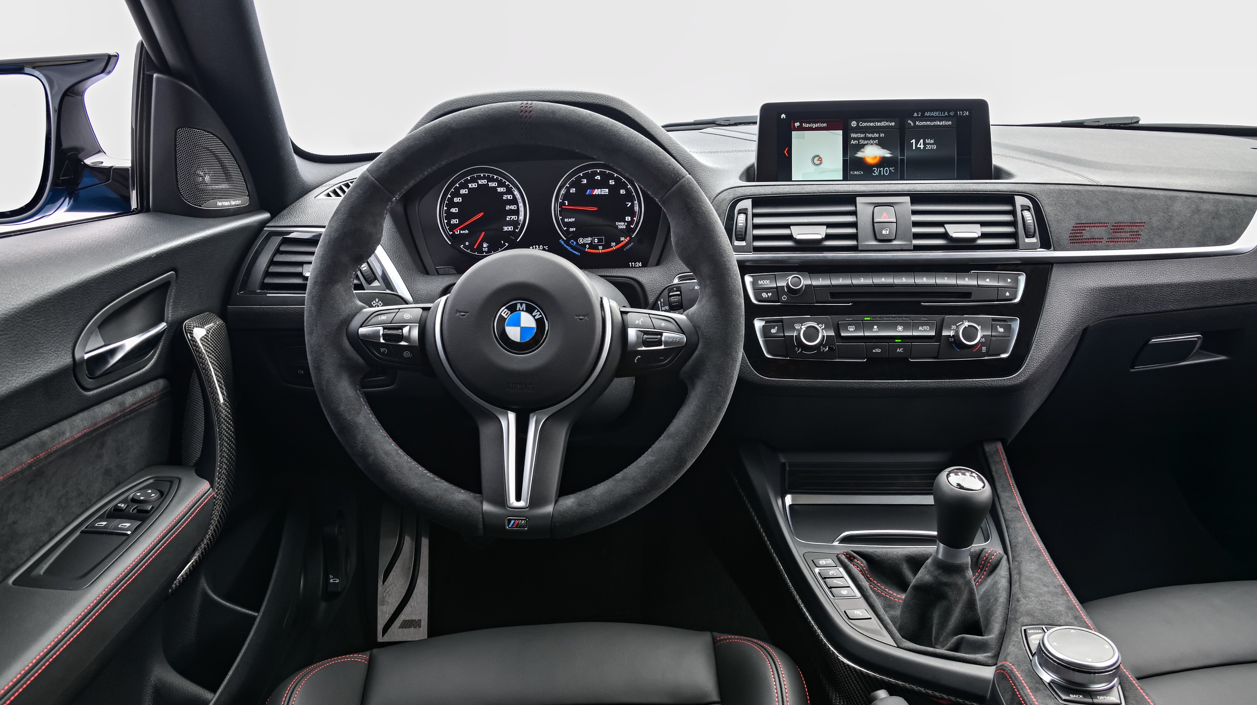 Los componentes en fibra de carbono (faldón, techo, alerón…) dan ya una idea de que el M2 CS es un producto especial. Y también los enormes frenos (cerámicos como opción) y los neumáticos semislick desarrollados a medida por Michelin, que aportan una adherencia impresionante, casi como si llevaran pegamento. Estas gomas requieren de alta temperatura para funcionar de forma óptima, al estilo de lo que sucede en la F1, y por eso BMW ofrece otras cubiertas, también de la marca francesa, que pierden algo de agarre, pero funcionan mejor con lluvia, ambientes fríos y otras situaciones cotidianas de conducción.