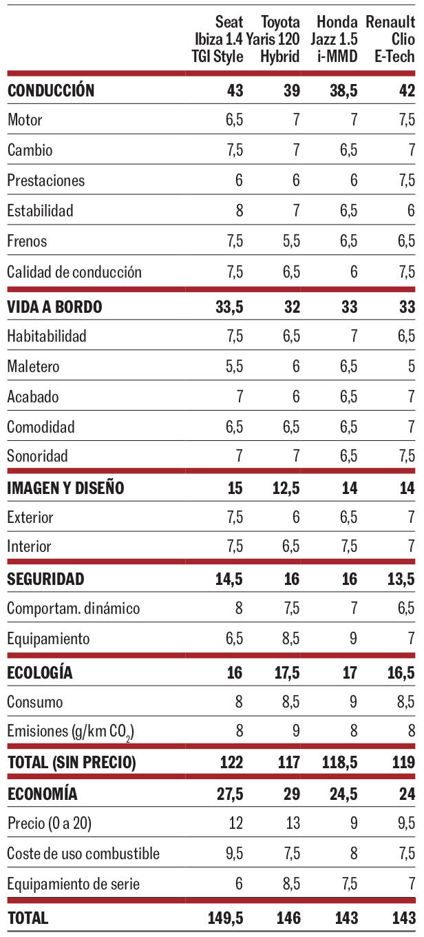 Ventaja clara del Ibiza, que tiene un coste de uso imbatible por el menor precio del gas natural (0,87 euros el kilo): 4,2 euros cada 100 kilómetros con los consumos de la prueba en un recorrido muy variado. El Jazz sube a 6,2 euros, el Yaris a 6,7 y el Clio a 6,9.