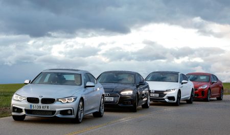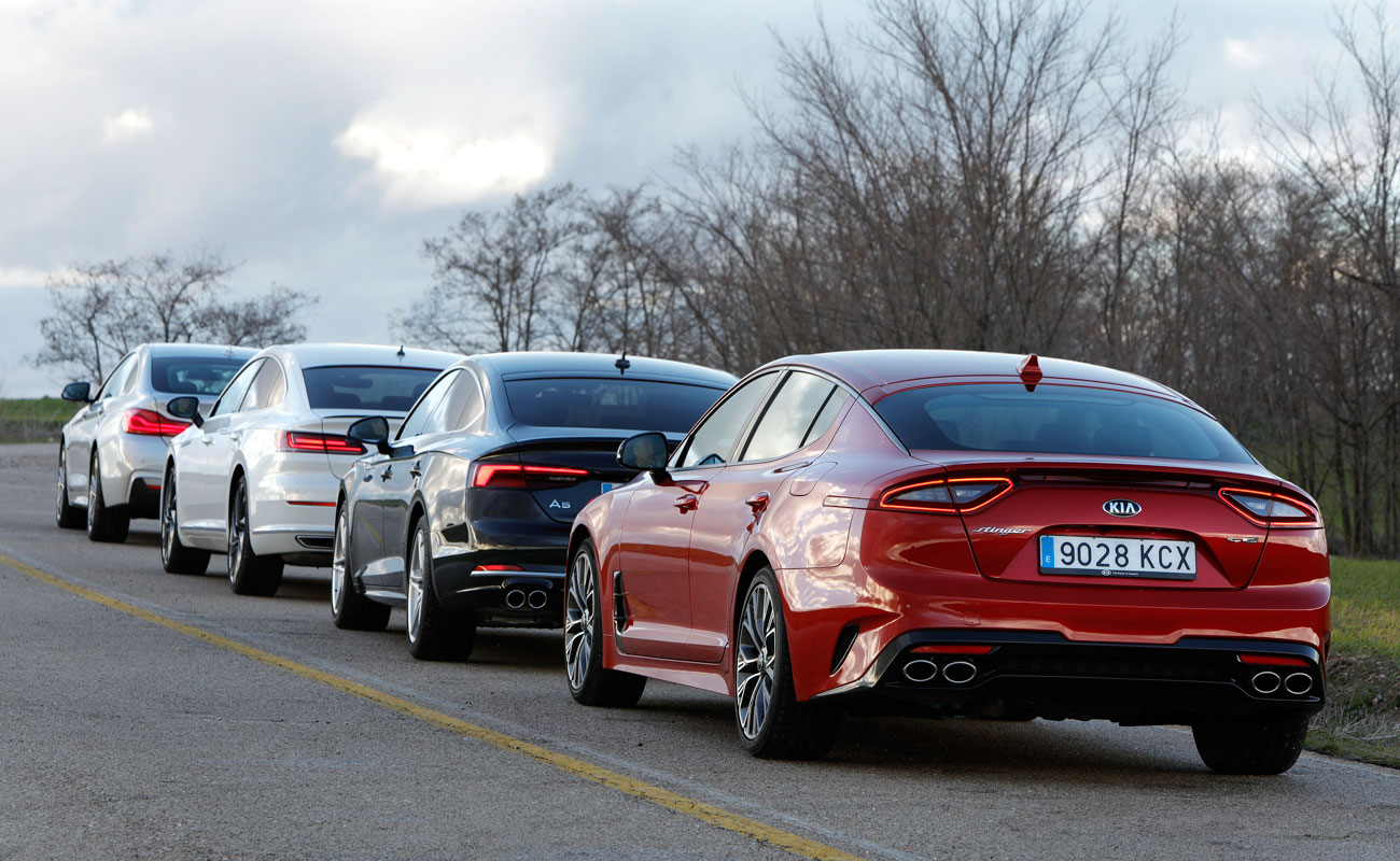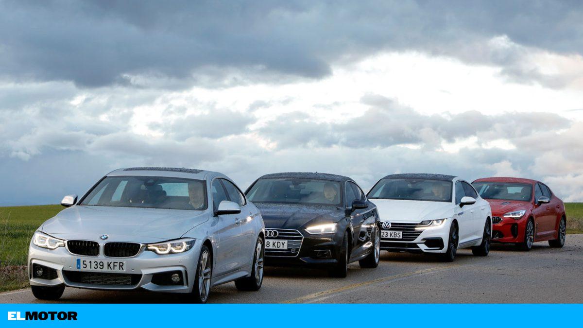 Cuatro berlinas de línea cupé con mecánicas diferentes. El Volkswagen y el Kia llevan motores 2.0 turbo de gasolina, con 280 y 255 CV, que van acoplados a cambios automáticos de doble embrague y convertidor de par con siete y ocho marchas, respectivamente. Pero mientras el primero incluye tracción 4×4, la unidad de pruebas del Stinger era de propulsión trasera, aunque está disponible en 4×4, pero como opción. El Audi y el BMW equipan motores 2.0 turbodiésel de 190 CV con cambios automáticos de siete y ocho marchas, y tracción 4×4.