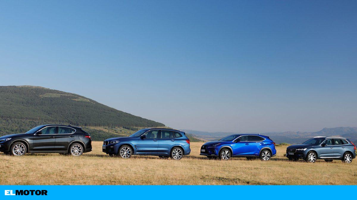 Cuatro todocaminos de tamaño medio y marcas exclusivas, todos con tracción 4×4: Alfa Romeo Stelvio 2.2D Executive AT8 Q4, BMW X3 xDrive 20d, Volvo XC60 D4 AWD Aut. Momentum y Lexus NX 300h (4×4) Executive.