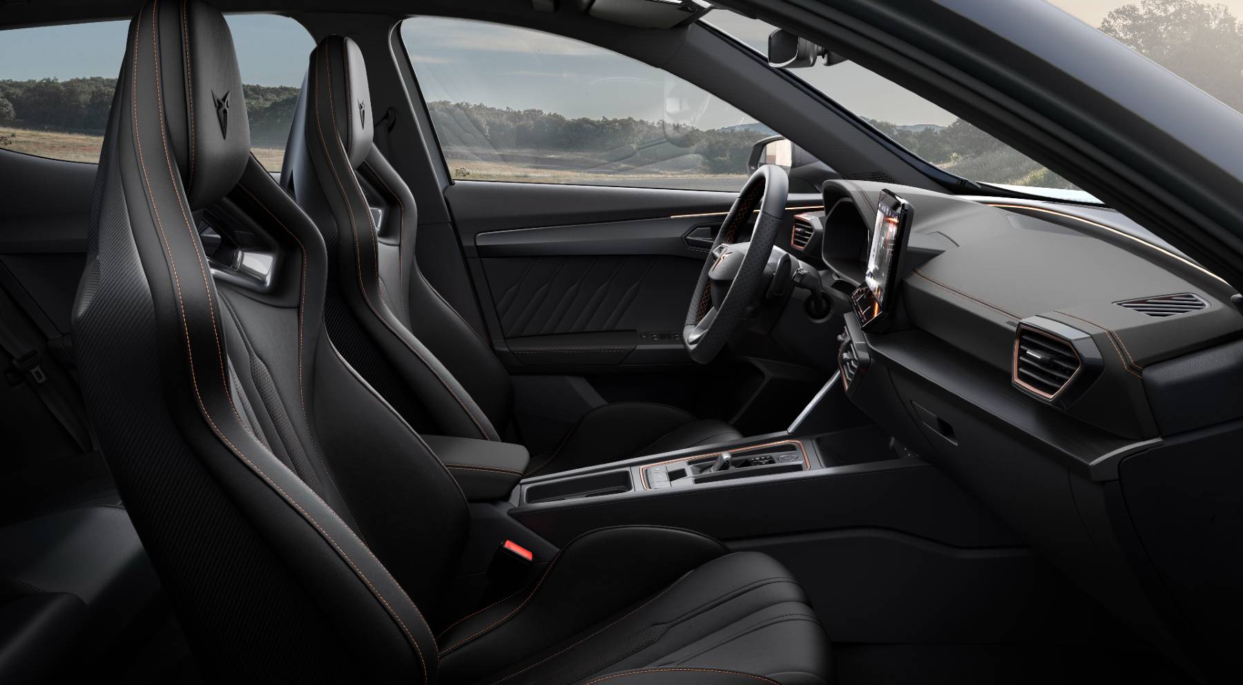 Tras acceder al Formentor VZ5, lo primero que llama la atención en la versión de pruebas son los nuevos asientos deportivos con la carcasa trasera en fibra de carbono. Terminados en cuero azul o negro, recogen perfectamente el tronco y sujetan con precisión al conductor y al copiloto en las zonas reviradas de curvas.