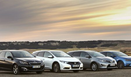 Los demás llevan motores 1.6 más pequeños, y destaca por su rendimiento el del Honda. Tiene 120 CV y es el más brillante a altas revoluciones, porque empuja con fuerza hasta 4.500 vueltas, casi como si fuera de gasolina. El León y el 308 estrenan dos 1.6 con 110 y 115 CV, respectivamente. Van muy bien, aunque corren un poco menos, pero lo compensan con consumos inferiores. Así, los dos japoneses ofrecen prestaciones algo superiores y adelantan y suben mejor, sobre todo con carga, y siempre con ventaja del Toyota. El Seat lleva un cambio más largo y a veces exige ir en una marcha inferior para seguir el ritmo de los otros. Pero en contrapartida es más silencioso y gasta menos en trazados amplios y autopista.