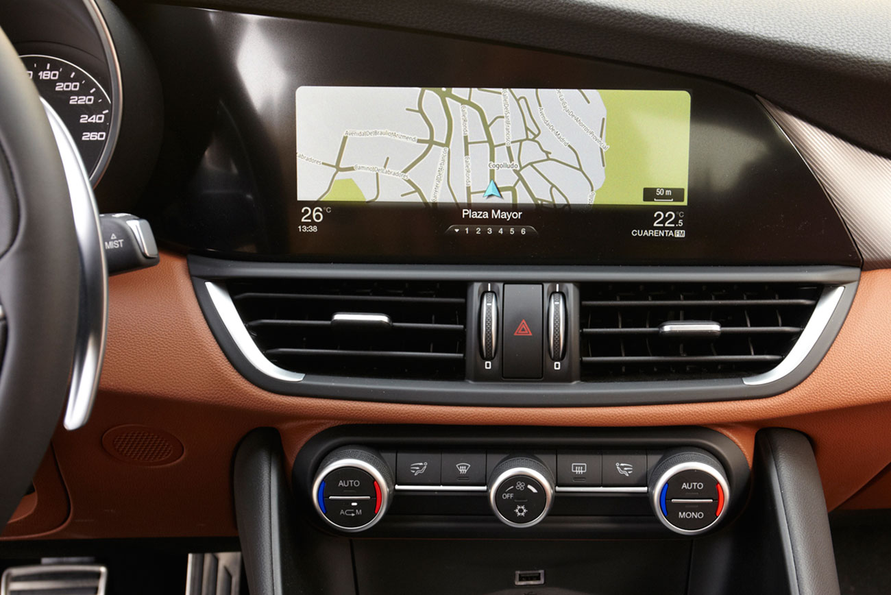 Dominio del Alfa, que se desmarca del clasicismo de las berlinas con una nueva interpretación italiana de la deportividad. Muestra un frontal ancho e imponente y formas más expresivas y contundentes. Y por dentro es también el más original, con una pantalla central a la última y muy bien integrada.