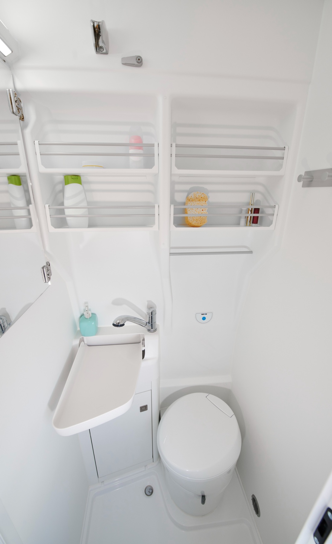 El somier, construido en una estructura 3D plástica, aguanta el peso y la forma del cuerpo sin perder firmeza. Por su parte, el baño, aunque es estrecho, permite ducharse con agua caliente, gracias a las dos bombonas de butano que van instaladas debajo de la cama, que proveen de agua caliente y calefacción —cuando el vehículo está parado— a esta Grand California. El váter es químico, como el de los aviones; dispone de un pequeño depósito de aguas negras que hay que vaciar tras los días de utilización.