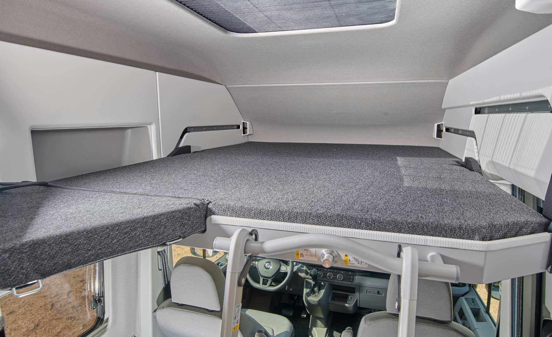 Lo que más llama la atención de esta cámper son las dos amplias camas y el pequeño baño que le confieren, junto a la cocina, total autonomía para moverse de un lado a otro sin pisar un hotel, por ejemplo. La primera cama se sitúa en el techo de la furgoneta y es ideal para niños o adultos de no más de 1,70 metros. La segunda, se ubica en la parte trasera del vehículo, tras la cocina y el baño, y es perfecta para todas las tallas, incluso las más grandes. Además, es supercómoda. Dos adultos duermen perfectamente sin echar de menos la cama de su casa.