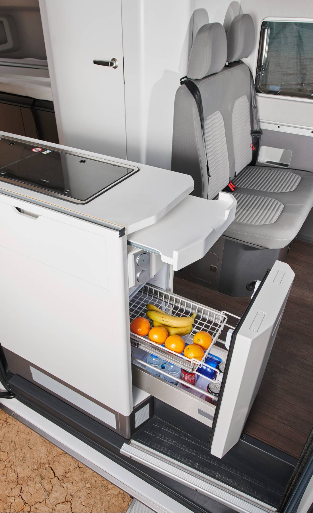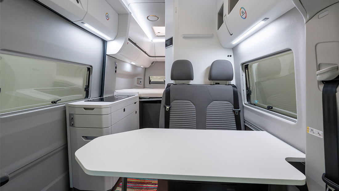 Siguiendo en la cocina, además de la pequeña encimera, también hay algunos cajones con cierre para transportar el menaje de cocina y demás utensilios. Corona esta zona de restauración, una nevera con una muy buena capacidad para botellas y alimentos. También dispone de un pequeño congelador. Para hacer vida y comer, además de la mesa exterior y las sillas (que van guardadas en las puertas traseras) dispone de otra mesa abatible en el interior, junto a la segunda fila de asientos. Las butacas del conductor y el pasajero se giran para situarse en torno a dicha mesa.