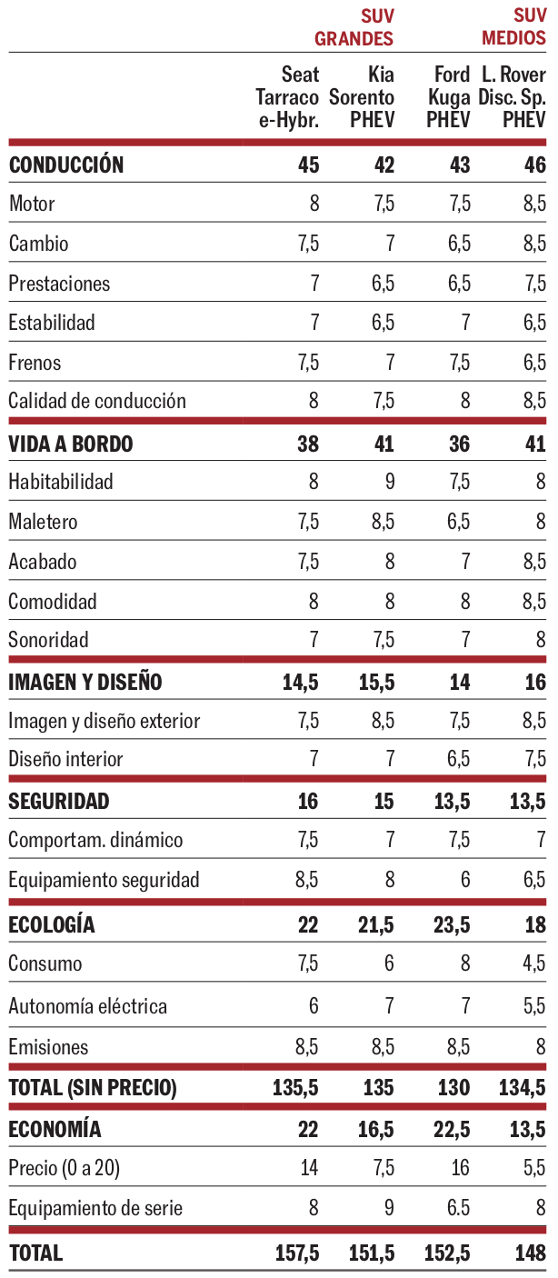 El Kuga se desmarca con un motor 2.5 turbo de gasolina (152 CV) y otro eléctrico (132 CV) que rinden 225 CV en total. Y el Discovery recurre a un pequeño 1.5 de tres cilindros (204 CV) y otro eléctrico (109 CV) para llegar a 309 CV. Entre los grandes, el Sorento combina un 1.6 turbo (180 CV) y un eléctrico (91 CV) que ofrecen 265 CV, mientras el Tarraco mantiene el módulo del Grupo Volkswagen: 1.4 turbo (150 CV) y un eléctrico (115 CV) que entregan 245 CV.