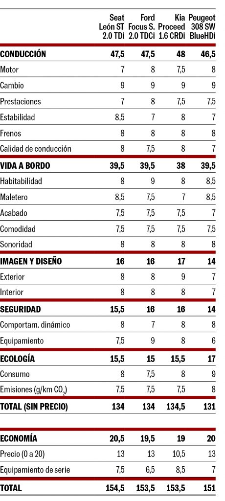 Victoria mínima del Seat por solo un punto gracias a su equilibrio general. Mantiene una línea deportiva y moderna, la mejor estabilidad y una conducción eficaz que se disfruta. Y añade un precio competitivo y el mejor maletero. El Ford y el Kia empatan por detrás. El primero es el más amplio y práctico para el uso familiar, y ofrece un equipo de seguridad y unas prestaciones superiores, pero con un tacto de dirección mejorable que penaliza el comportamiento. El Proceed aporta una imagen imponente, el mejor equipo de serie y siete años de garantía, aunque tiene el precio más elevado. El Peugeot es el más veterano y lo acusa en detalles como las ayudas a la conducción, siempre opcionales. El puesto de conducción no se adapta bien a todas las estaturas, pero es el que menos gasta y ofrece un maletero tan grande como el León. Sigue toda la información de EL MOTOR desde Facebook, X o Instagram