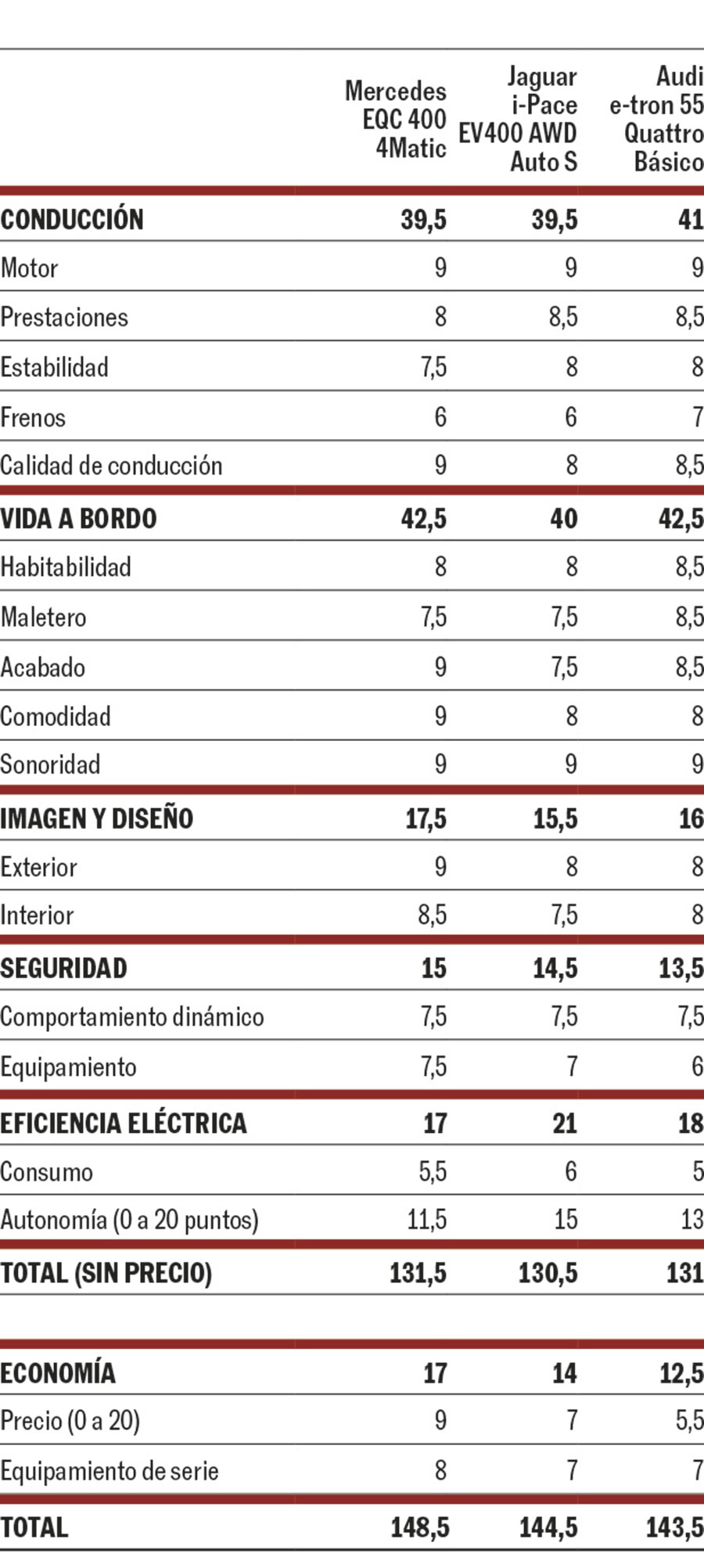Las consecuencias de esta espiral se reflejan en los protagonistas de la prueba, tres SUV grandes y exclusivos (4,7 a 4,9 metros de largo): Mercedes EQC, Jaguar i-Pace y Audi e-tron. Son modelos pioneros y equivalentes, a los que se habría unido el Tesla Model X, algo mayor (5,05 metros), pero acaba de recibir algunas mejoras y no había unidades disponibles. Sin embargo, ninguno puede cumplir como primer coche familiar porque apenas llegan a 300 kilómetros de autonomía real, y solo en ciudad o autopistas de trazados sin mucho cambio de relieve ni complicaciones.