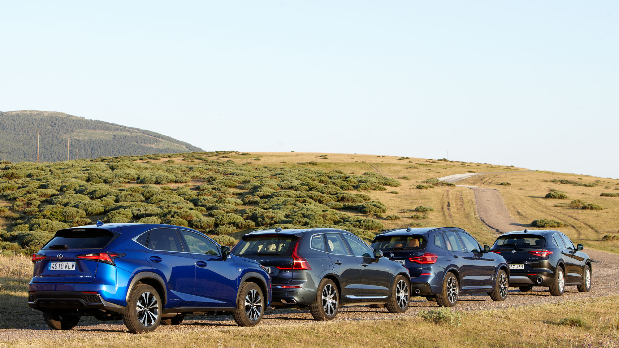 Alternativas diferentes. El BMW y el Volvo llevan mecánicas 2.0 turbodiésel de 190 CV, y el Alfa, un 2.2 de 210 CV. El Lexus equipa un híbrido con dos motores, gasolina y eléctrico, que suman 197 CV. Los primeros equipan cambios automáticos de ocho marchas accionables en el volante, y el japonés, un sistema de engranajes con una sola marcha, como el variador de los escúteres, aunque permite reducir con levas desde el volante. Además, incluyen varios modos de conducción para adaptar la respuesta: Eco, Normal, Sport… Y aunque no están pensados para el campo, todos llevan tracción 4×4 (eléctrica en el Lexus) y permiten recorrer pistas de tierra, siempre con el cuidado y los límites que exige su ajustada altura al suelo.