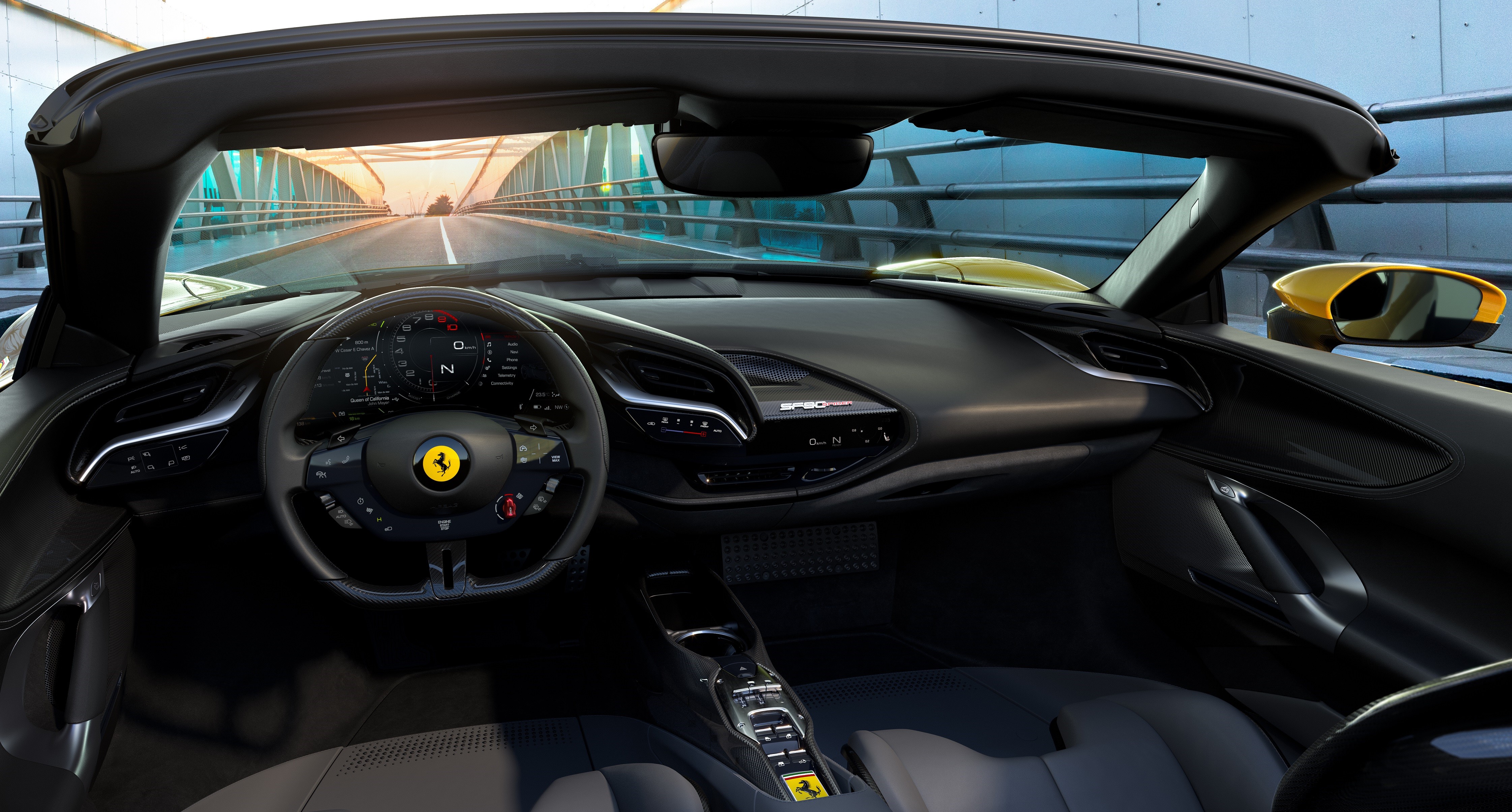El peso en seco del Ferrari SF90 Spider, sin líquidos, es de 1.670 kilos, que subirán a unos 1.770 en orden de marcha, con el depósito lleno además del aceite y el refrigerante. No es bajo para un superdeportivo, pero sí muy meritorio para un descapotable de 1.000 CV, con mecánica híbrida enchufable, tracción 4×4 y dimensiones tirando a grandes, porque mide 4,7 metros de longitud y roza los dos de anchura. La altura, eso sí, es mínima: apenas 1,1 metros. Además, el Ferrari SF90 Spider viene bien equipado y cuenta entre otras cosas con un interior digitalizado, sistemas como la proyección HUD en el cristal y un techo duro retráctil eléctrico que puede accionarse en marcha hasta 45 km/h.