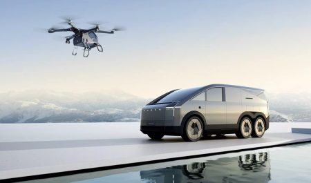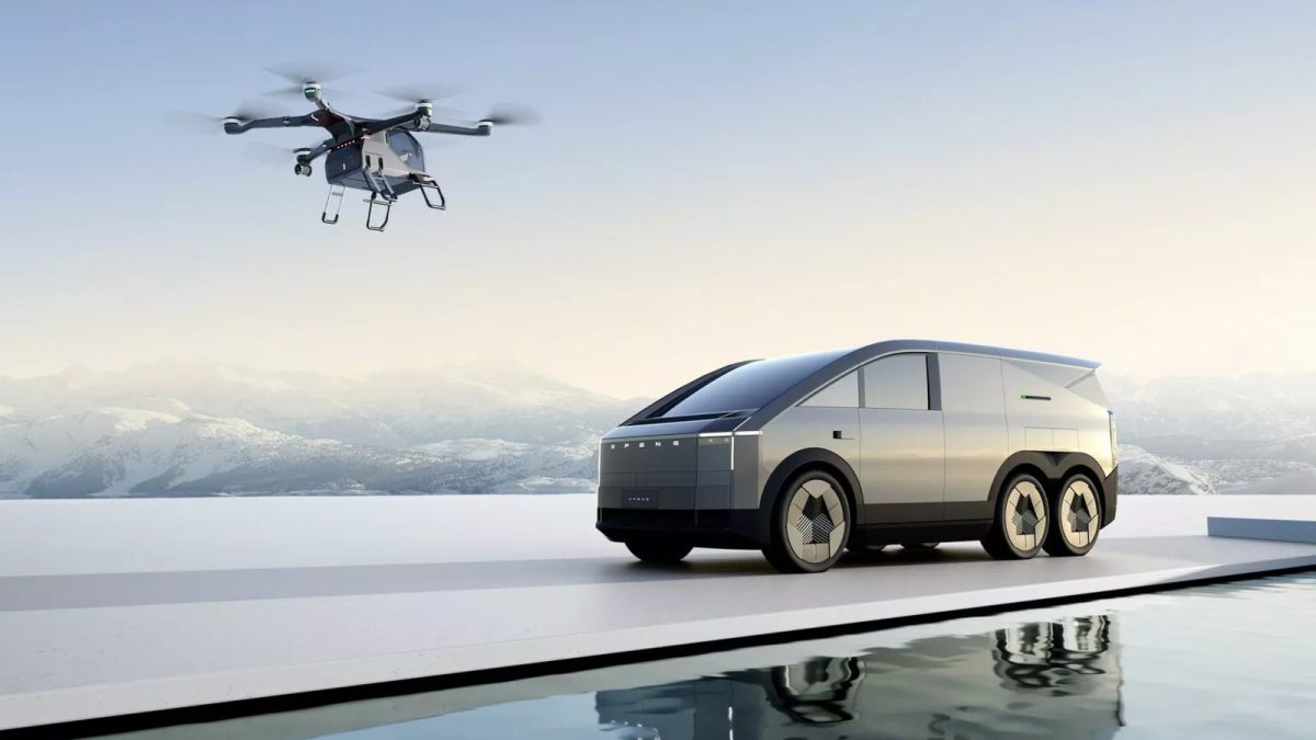 El Xpeng AeroHT cuenta con un diseño similar al de un Tesla Cybertruck, pero tiene seis ruedas, una espaciosa cabina y una enorme zona de carga trasera donde se puede transportar un dron eléctrico de dos plazas.