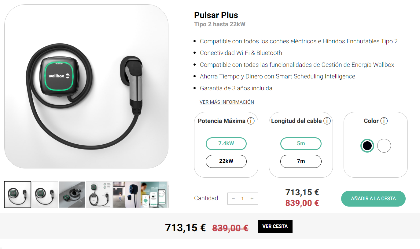 El cargador de Wallbox (tipo 2, 7,4 kW y con cable de 5 metros) cuenta con un 20% de descuento en Amazon. “Compatible con todas las instalaciones domésticas y vehículos eléctricos e híbridos enchufables del mercado con conector tipo 2”, aclara la marca.