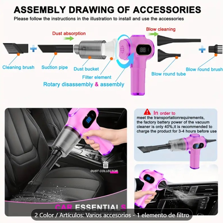 Este dispositivo destaca por sus funciones de succión y soplado, lo que lo convierte en una herramienta versátil tanto para la limpieza de interiores de vehículos como para el hogar.