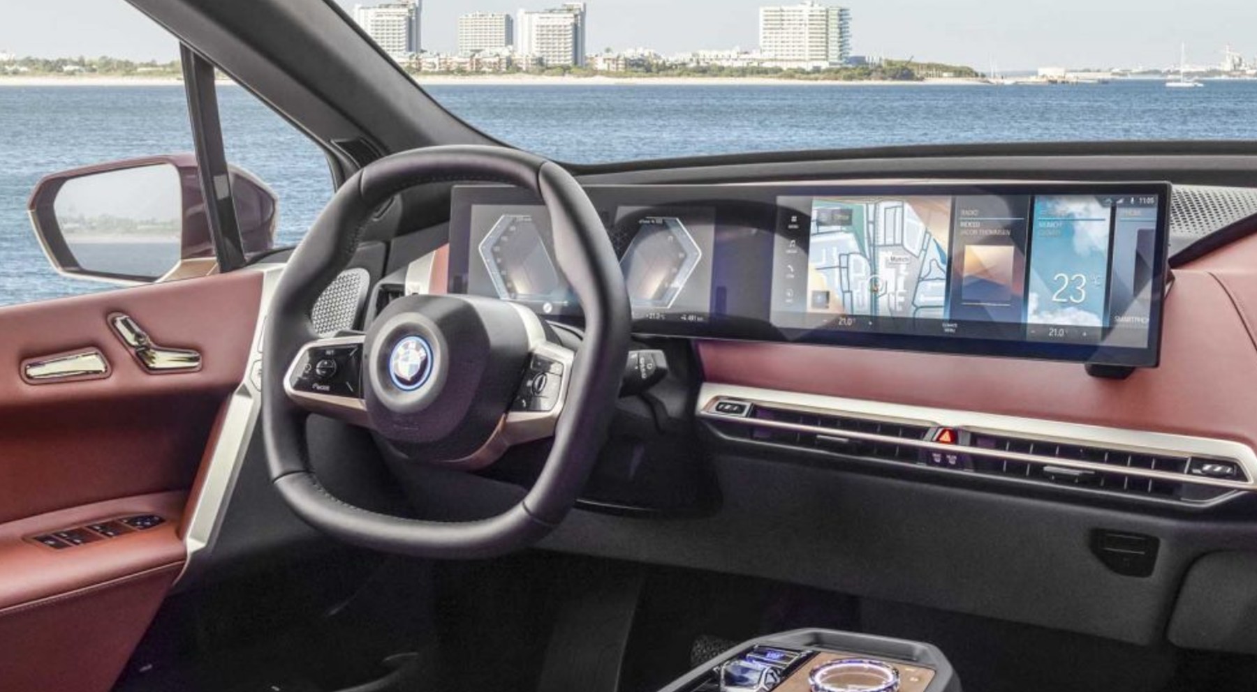El gran SUV eléctrico BMW iX refleja los avances de esta tecnología con un conjunto formado por el cuadro de instrumentos y la consola central, de 12,3 y 14,9 pulgadas, respectivamente, que recogen toda atención del conductor y los pasajeros en el habitáculo.