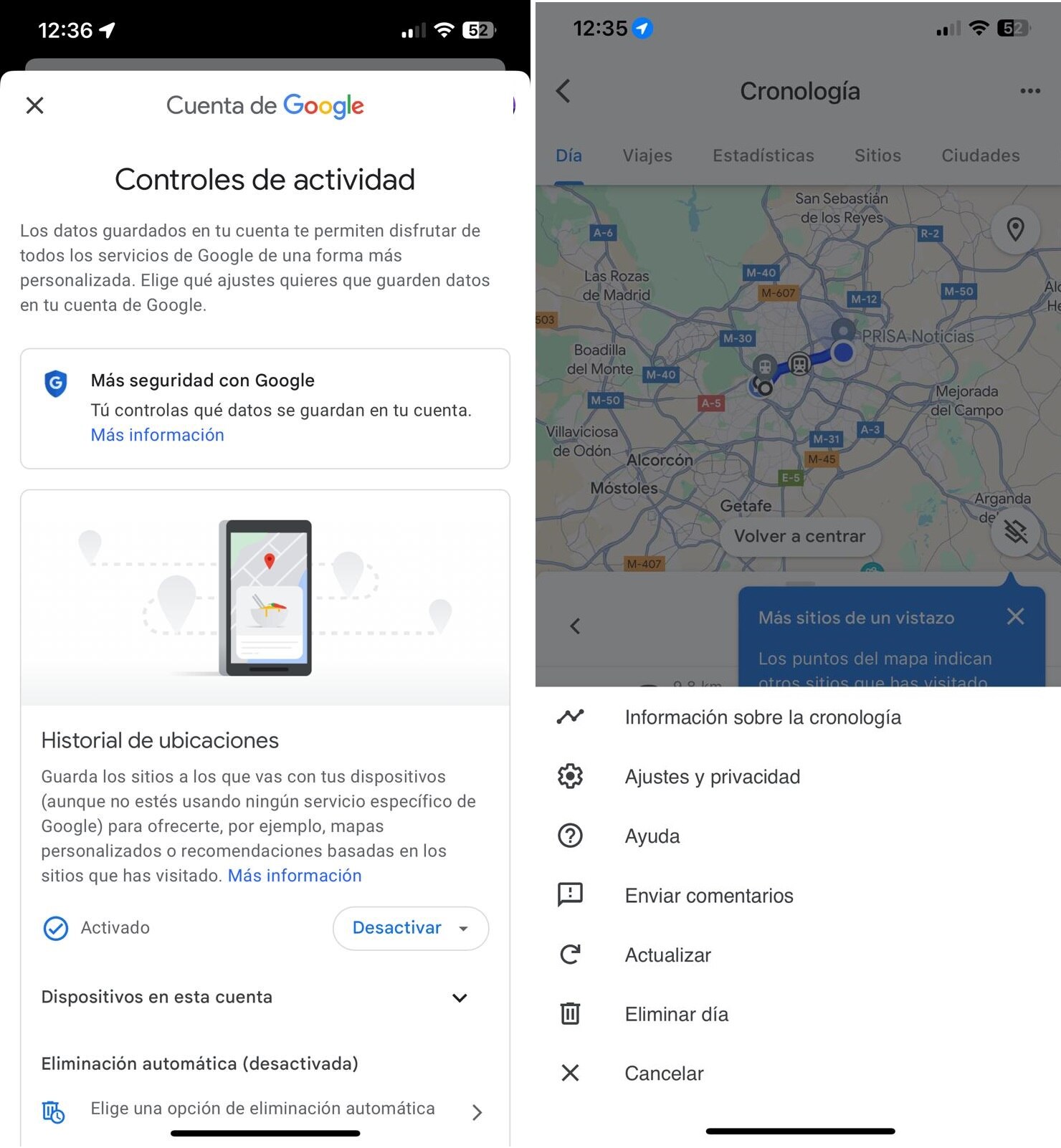 Por otra parte, hay varias opciones para gestionar los datos. Por ejemplo, se puede configurar la eliminación automática después de 3, 18 o 36 meses. Para configurarlo, es necesario ir al icono de perfil, luego a Cronología, Información sobre la cronología, Ajustes y Eliminación automática.