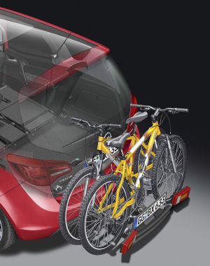 Sale del parachoques posterior como un cajón extraíble y permite transportar hasta cuatro bicis. Opel es la marca que mejor ha resuelto el transporte de bicicletas en el coche, por su sencillez de uso y capacidad. Su invento se denomina Flex Fix.