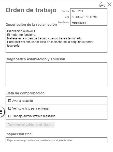 El simulador cuenta con tres niveles y es necesario ir solucionando averías para ir avanzando. El mecánico a prueba recibirá una orden de trabajo y deberá rellenar la ficha con el respectivo diagnóstico.