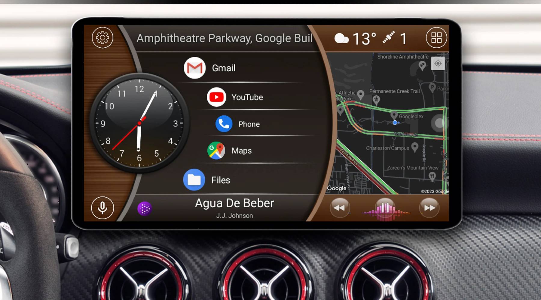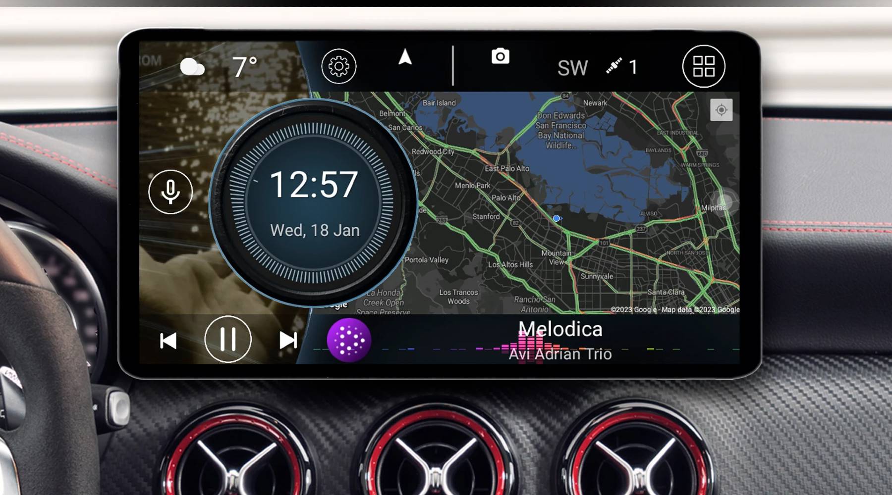 En marcha solo se muestran los controles de navegación e interactuar con diferentes widgets, los satélites disponibles, Google Assistant o el control de reproducción de la música.
