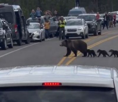 Una mamá oso y sus tres cachorros consiguen cruzar la carretera y hacer que todos los conductores solo tengan ojos para ellos.
