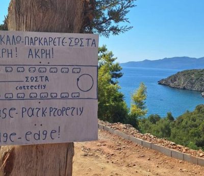 Un cartel ha aparecido en una pequeña cala de Grecia intentando explicar a los conductores incívicos cómo aparcar correctamente.